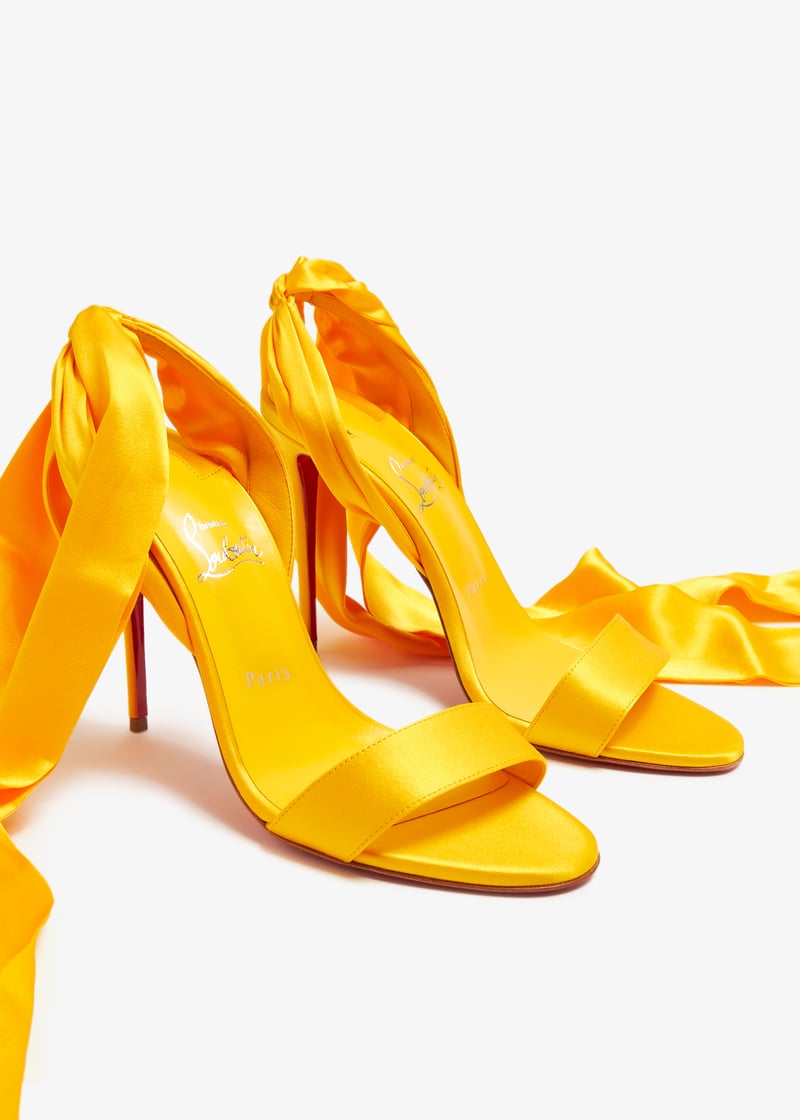 تُعبر دار كريستيان لوبوتان عن افتتانها بالتفاصيل مع صندل دو ديزير 100. يأتي بتصميم وشاح من ساتان الكريب الناعم، يلتف حول الكاحل بمظهر ينبض بالأنوثة. يكتمل التصميم بكعب عالي رفيع.